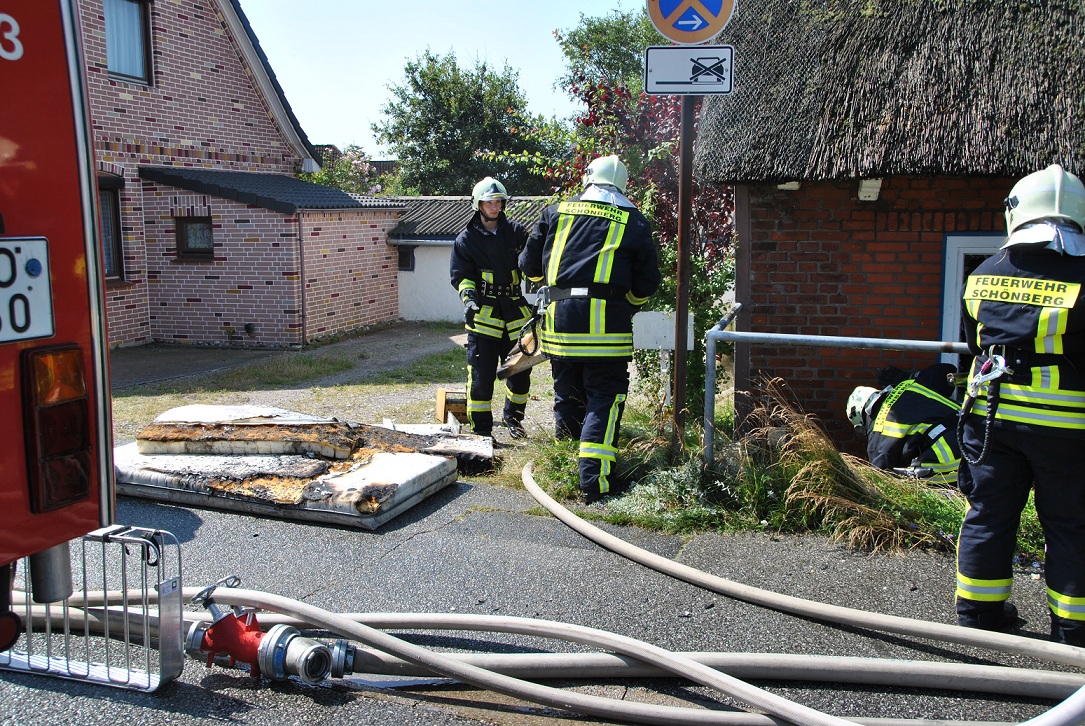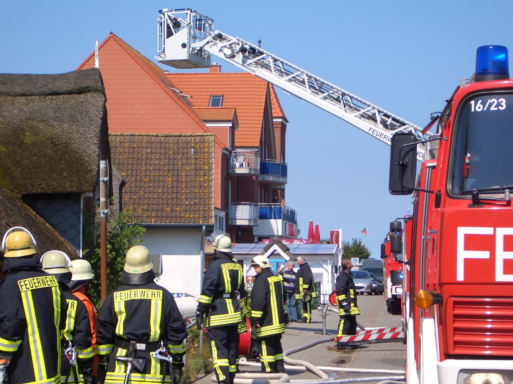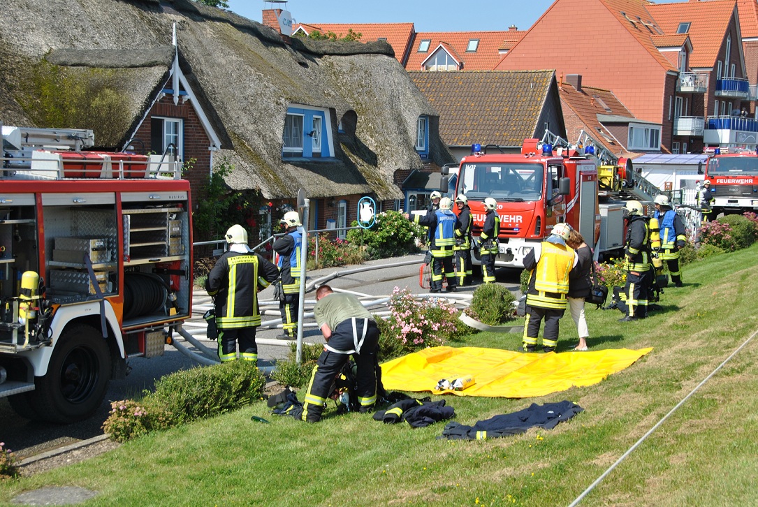 Wir wurden zu einer starken Rauchentwicklung in einem Reetdachhaus am Schönberger Strand alarmiert. Bei dem Gebäude im Bereich der Promenade handelte es sich um ein Doppelhaus. Am Einsatzort konnten wir eine Rauchentwicklung im Erdgeschoß der linken Doppelhaushälfte feststellen. Zu diesem Zeitpunkt waren keine Personen mehr im Gebäude. Es wurden sofort 2 Atemschutztrupps zur Brandbekämpfung eingesetzt. Die Atemschutztrupps setzten die Wärmebildkamera ein, um den Brandherd zu lokalisieren. Vorsorglich wurden um 11.23 Uhr die Wehren Stakendorf und Wisch nachalarmiert. In einem Gästezimmer hatten die Atemschutztrupps den Brandherd lokalisiert und begannen sofort mit der Brandbekämpfung. Gegen 11.38 Uhr konnte der Leitstelle "Feuer unter Kontrolle" gemeldet werden. Ein Übergreifen des Feuers auf das Reetdach konnte durch die Einsatzkräfte verhindert werden. Ein Überdrucklüfter wurde zum belüften des Gebäudes eingesetzt. Nachdem ein weiterer Atemschutztrupp den Brandraum auf Glutnester überprüft hatte, konnte um 11.47 Uhr "Feuer aus" gemeldet werden. Die Einsatzstelle wurde um 12.36 Uhr an die Polizei übergeben.