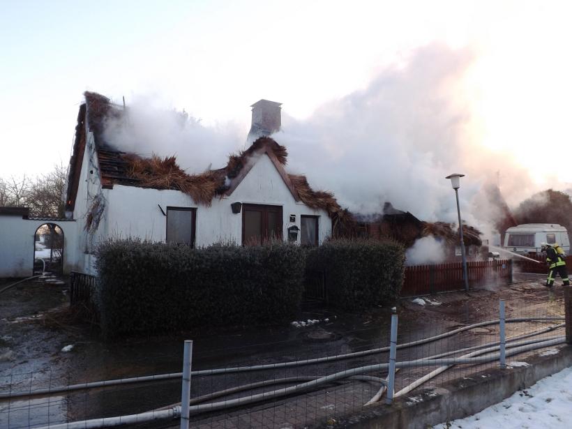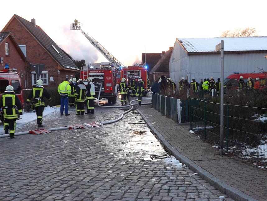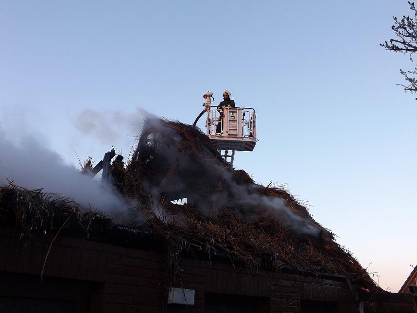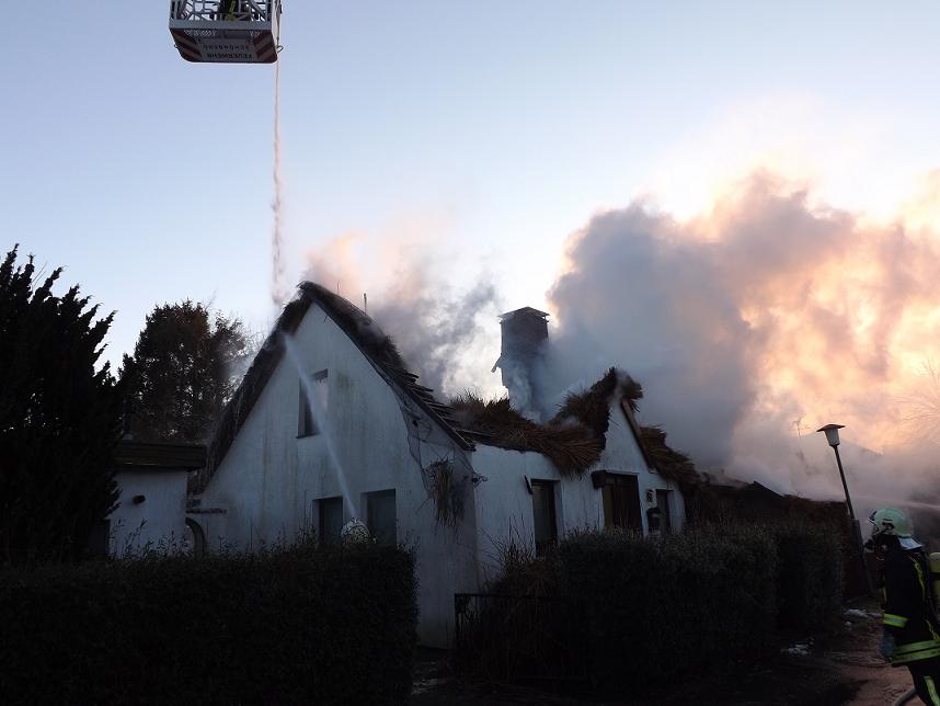 Wir wurden von der zuständigen Wehr Hohenfelde zu einem Großfeuer in der Schausterstraat zur Unterstützung nachalarmiert. Durch den zuständigen Einsatzleiter wurden wir zur Brandbekämpfung eingesetzt. Es handelte sich um ein Wohnhaus mit einem Reetdach. Der Dachstuhl des Hauses brannte bereits in voller Ausdehnung. Aufgrund der starken Rauchentwicklung wurden 5 Atemschutztrupps bei der Brandbekämpfung eingesetzt. Weiterhin wurde die Drehleiter zur Brandbekämpfung mit dem Wenderohr genutzt. Der ELW wurde für die Unterstützung der Einsatzleitung in den Einsatz eingebunden. Nachdem die Brandbekämpfung abgeschlossen war, wurde der Schornstein und ein Giebel mit einem Bagger eingerissen. Danach wurde die Brandstelle von der Drehleiter aus mit Schwerschaum eingeschäumt. Ein weiterer Einsatz unserer Feuerwehr war nicht mehr erforderlich. Gegen 19.20 Uhr konnte die Einsatzstelle verlassen werden.