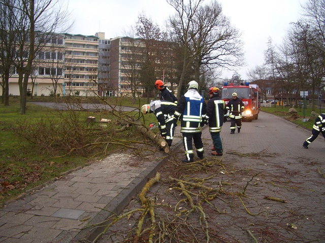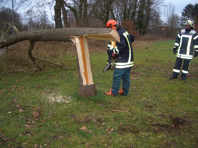 Wir wurden von der Polizei Schönberg zu einem Sturmschaden im Bereich der Straße Bramhorst alarmiert. Bei einem Baum hatte sich der Wurzelteller gelöst und drohte auf die Fahrbahn zu fallen. Die Straße wurde gesperrt und der betroffene Baum gefällt. Nachdem der Baum zersägt wurde, konnte die Fahrbahn gereinigt werden. In Absprache mit der Polizei wurde die Straße für den Verkehr wieder freigegeben.